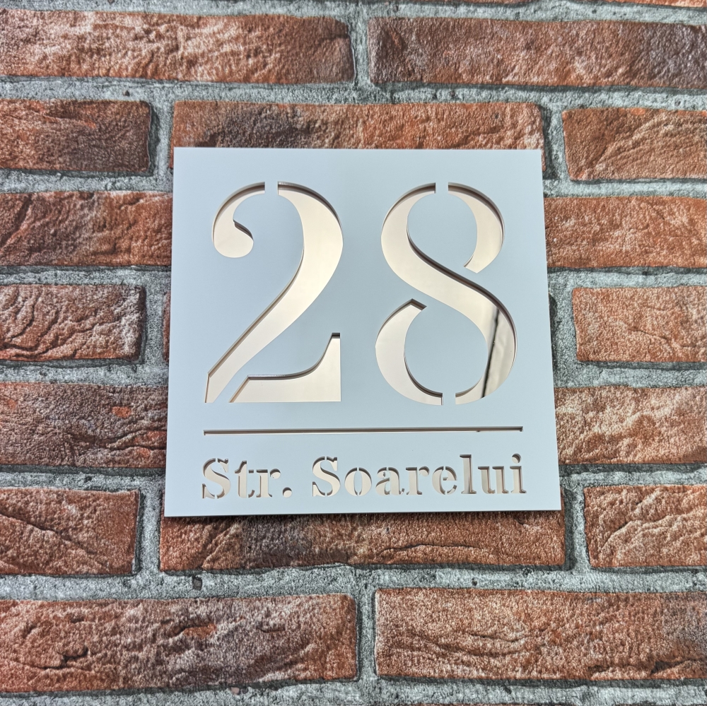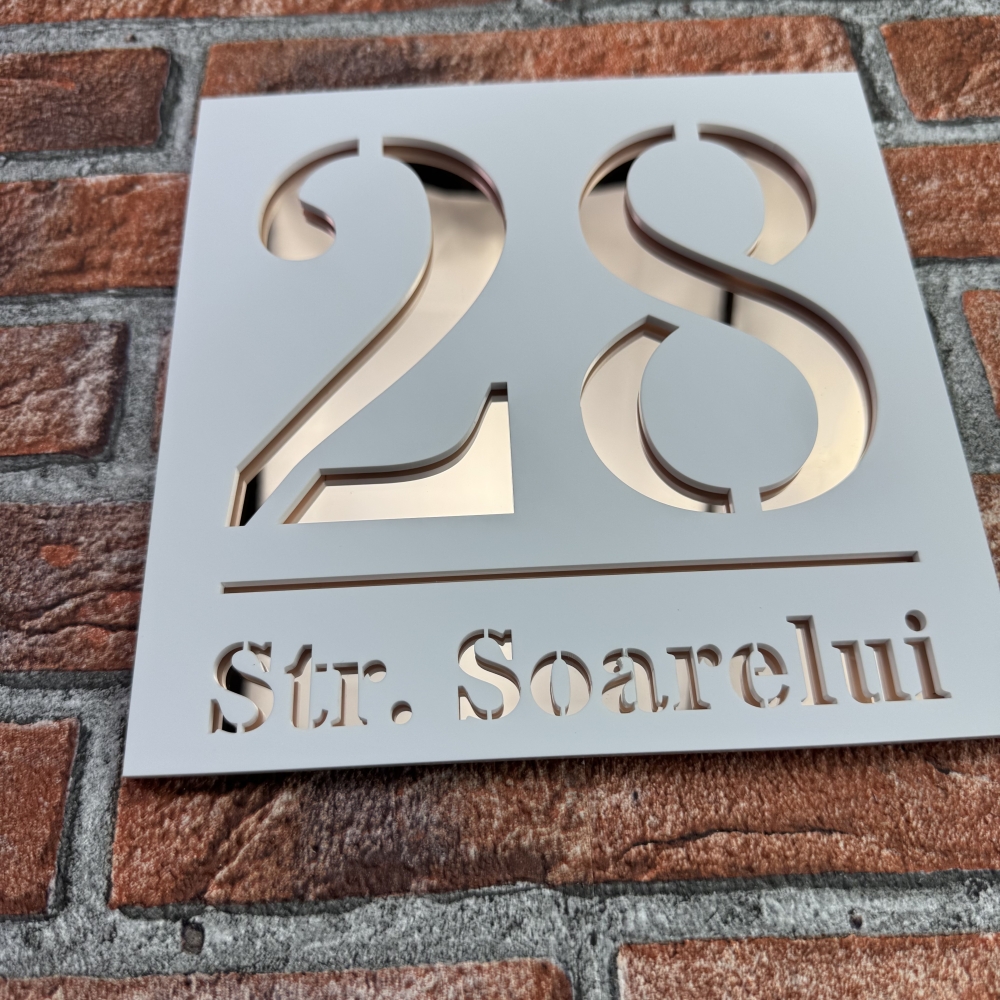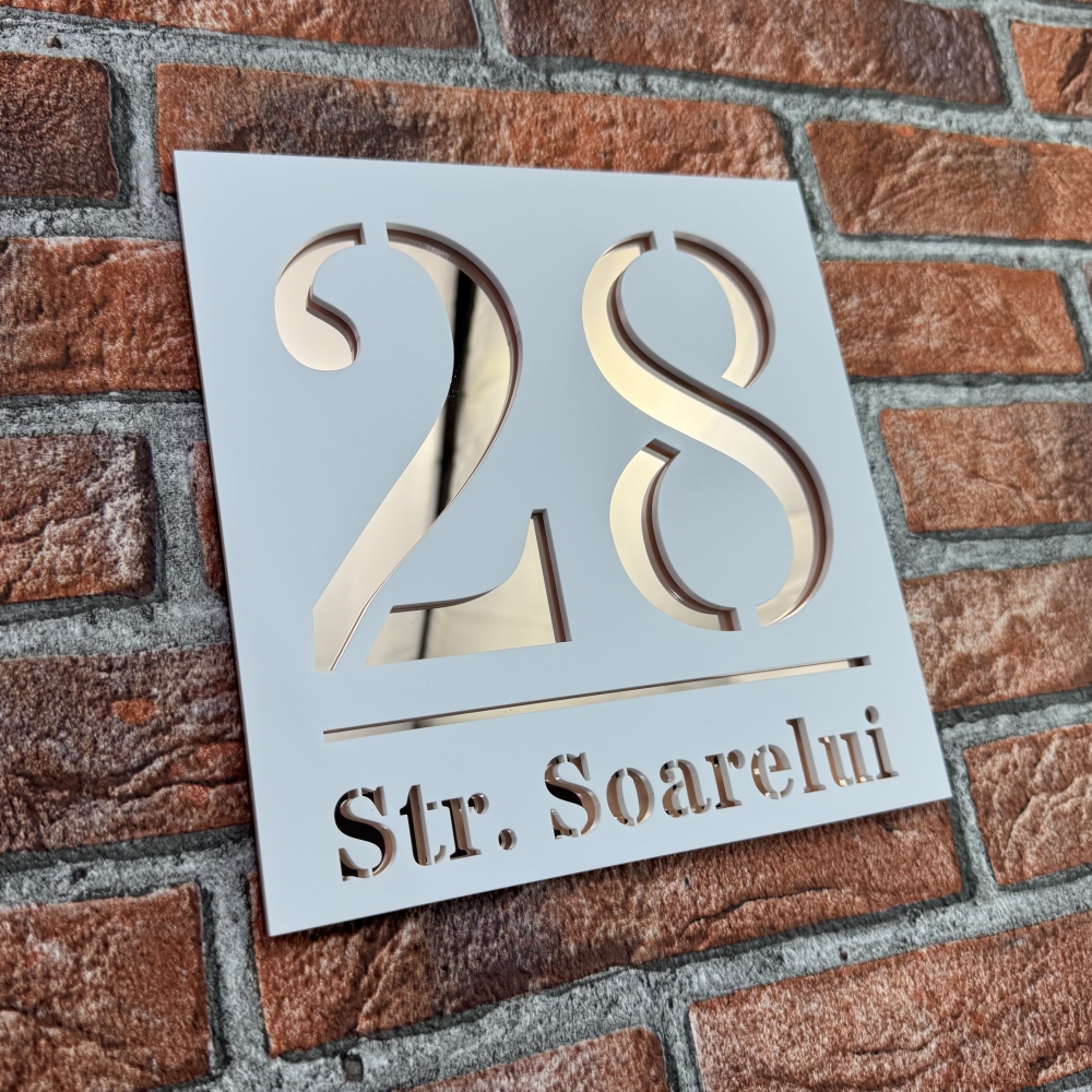 Adauga eleganta fatadei casei tale cu aceasta placuta personalizata, disponibila in Alb Mat si Oglinda Roz. Vizibila, durabila si usor de montat, combina stilul modern cu functionalitatea.