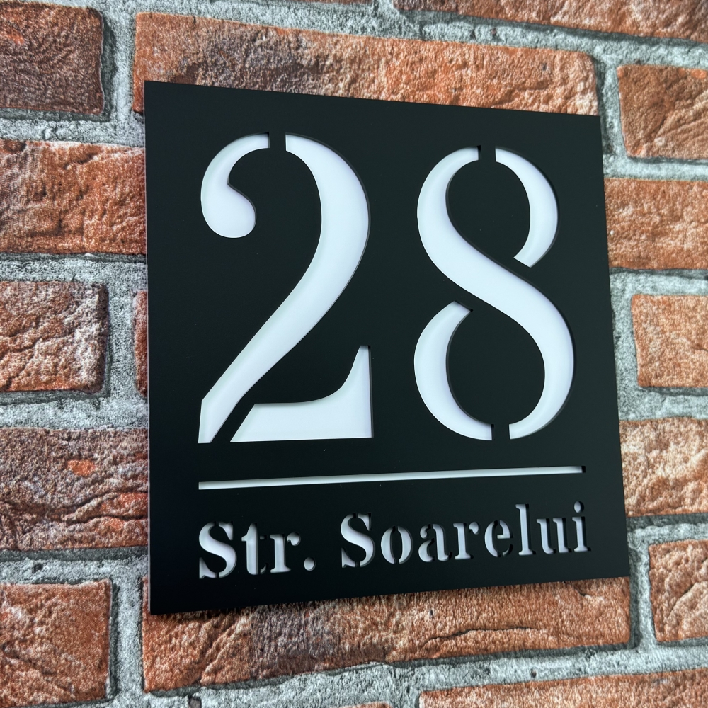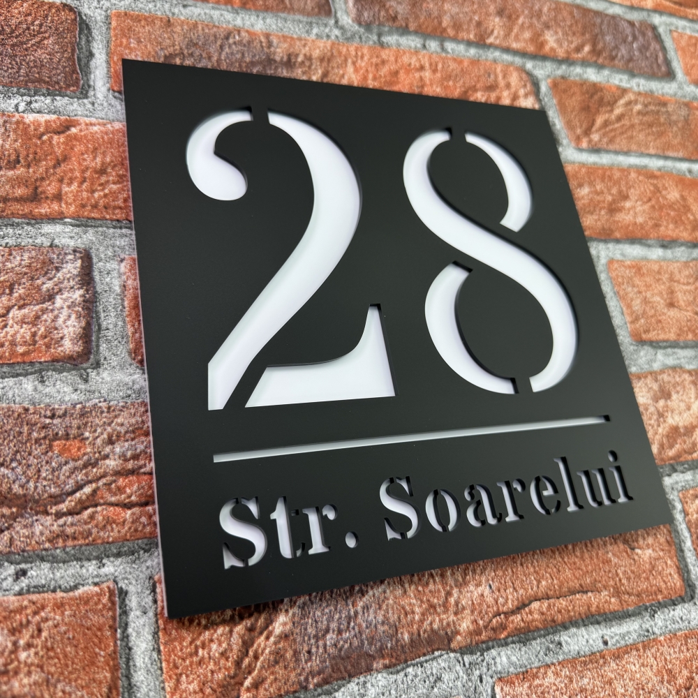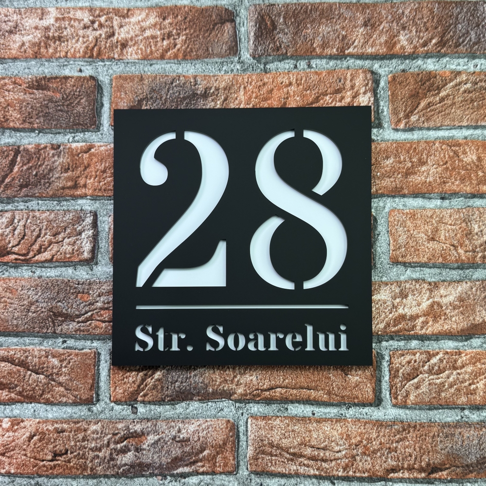 Adauga eleganta fatadei casei tale cu aceasta placuta personalizata, disponibila in Negru Mat si Alb Mat. Vizibila, durabila si usor de montat, combina stilul modern cu functionalitatea.