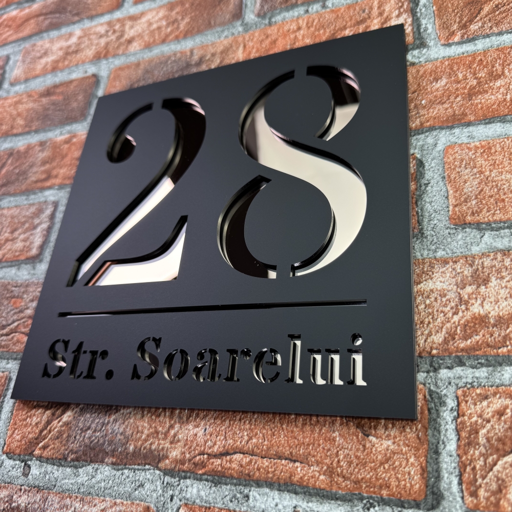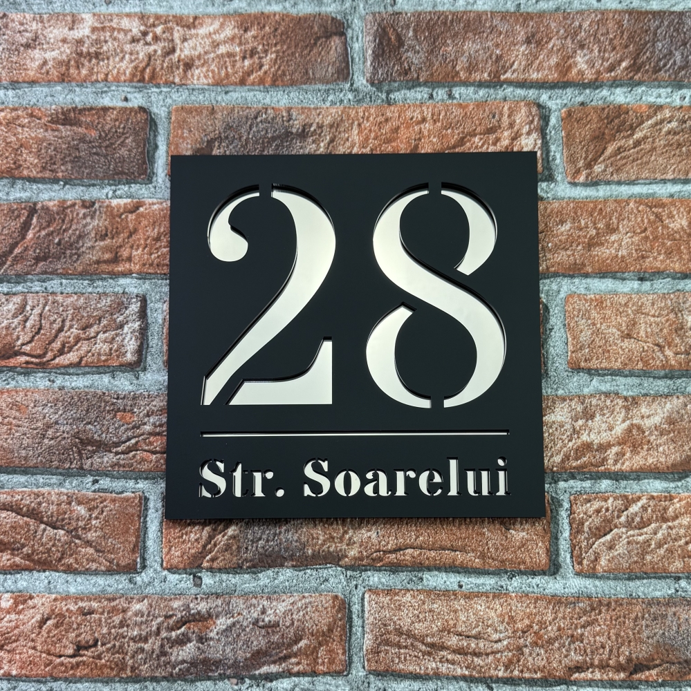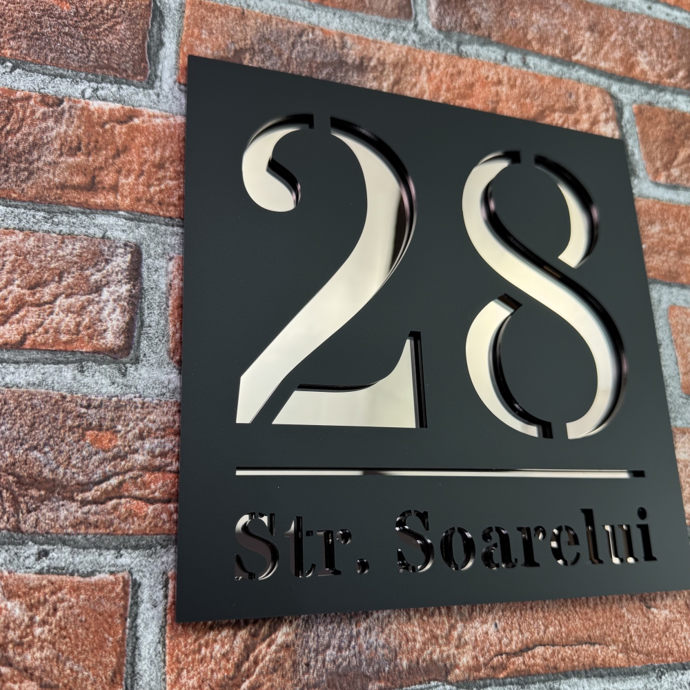 Pe langa aspectul estetic, aceasta placuta este si functionala. Dimensiunea de 19.5 x 19.5 cm garanteaza ca numarul este usor de identificat de vizitatori, curieri sau servicii de urgenta. Alegerea intre Negru Lucios si Oglinda Auriu iti permite sa personalizezi casa exact asa cum iti doresti, transformand un element practic intr-un detaliu de design memorabil.