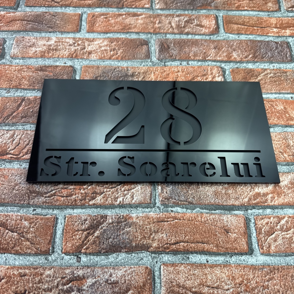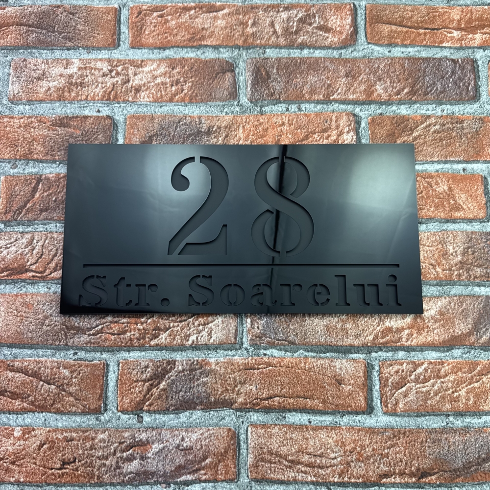 Designul si procesul de fabricatie garanteaza un rezultat uniform si un aspect vizual superior. Fie ca este vorba despre o locuinta privata, o pensiune sau un spatiu comercial, placuta numar casa personalizat Negru Lucios / Negru Mat adauga un plus de stil si profesionalism. Aceasta placuta nu doar ca indica numarul casei, dar devine un element de decor care exprima bun gust si atentia la detalii.