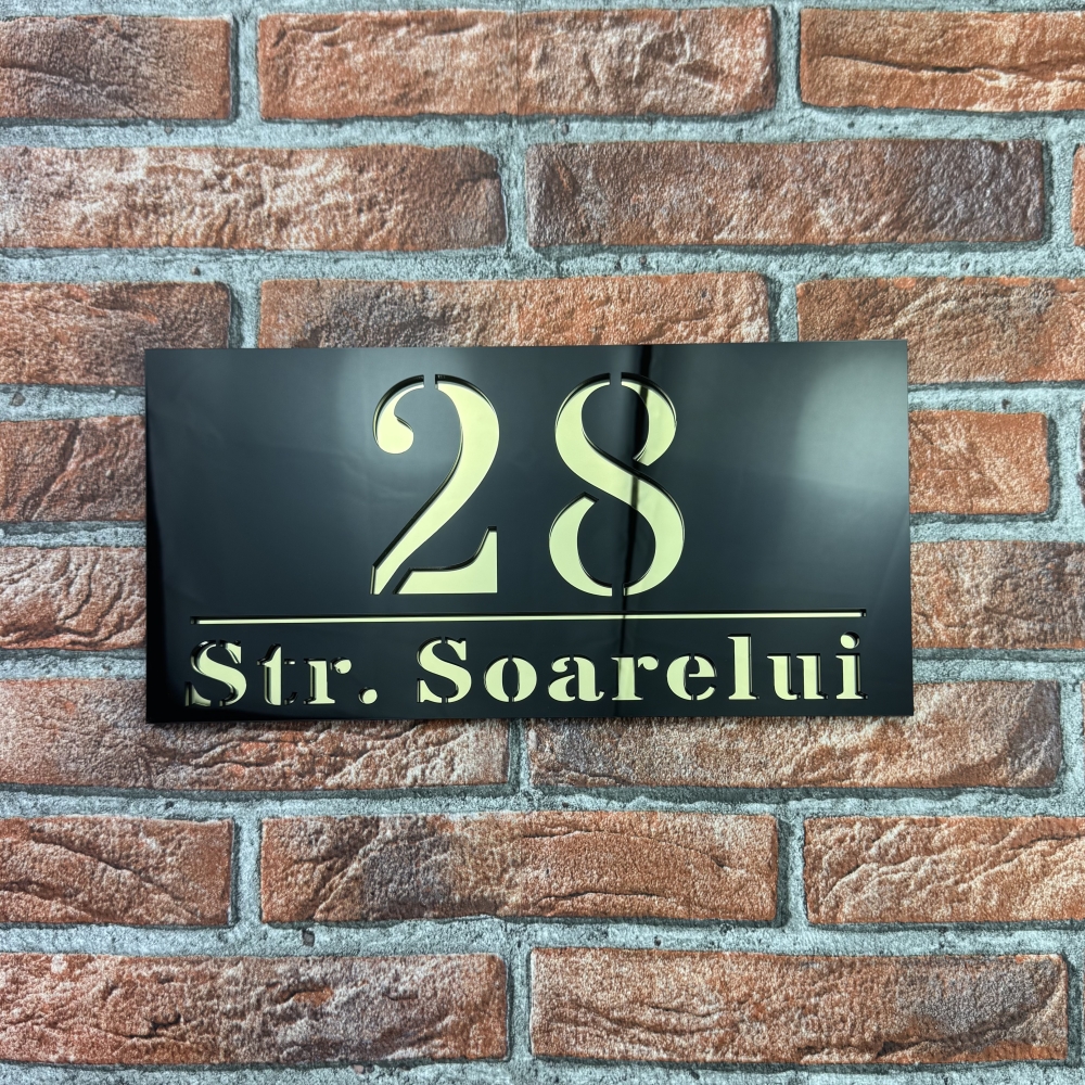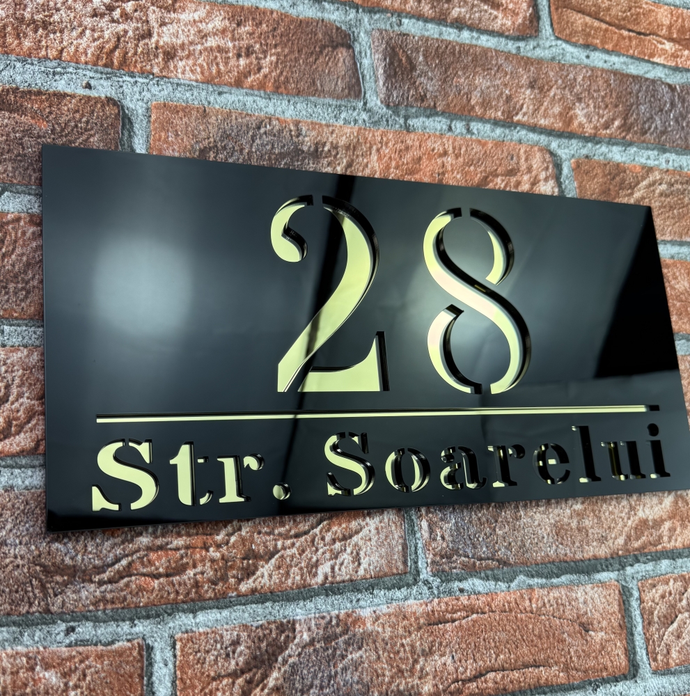 Designul si procesul de fabricatie garanteaza un rezultat uniform si un aspect vizual superior. Fie ca este vorba despre o locuinta privata, o pensiune sau un spatiu comercial, placuta numar casa personalizat Negru Lucios / Oglinda Auriu adauga un plus de stil si profesionalism. Aceasta placuta nu doar ca indica numarul casei, dar devine un element de decor care exprima bun gust si atentia la detalii.