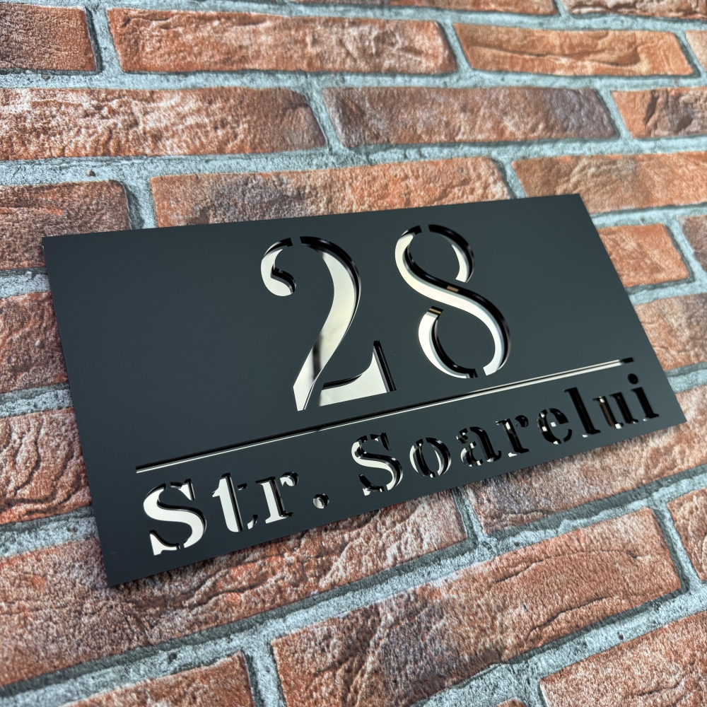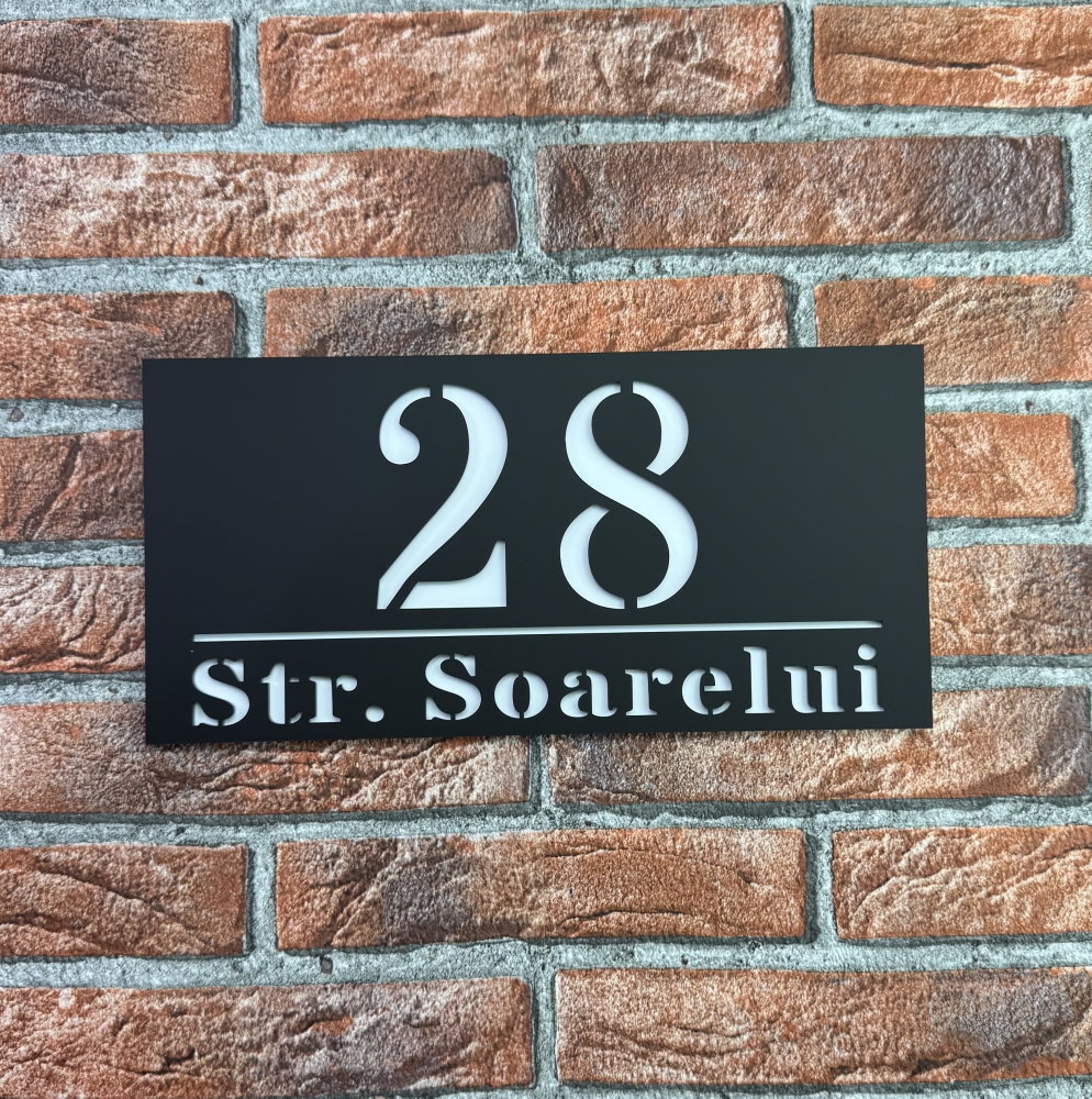 Designul si procesul de fabricatie garanteaza un rezultat uniform si un aspect vizual superior. Fie ca este vorba despre o locuinta privata, o pensiune sau un spatiu comercial, placuta numar casa personalizat Negru Mat / Alb Mat adauga un plus de stil si profesionalism. Aceasta placuta nu doar ca indica numarul casei, dar devine un element de decor care exprima bun gust si atentia la detalii.