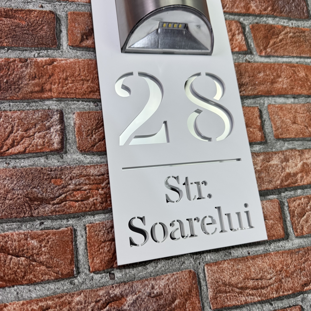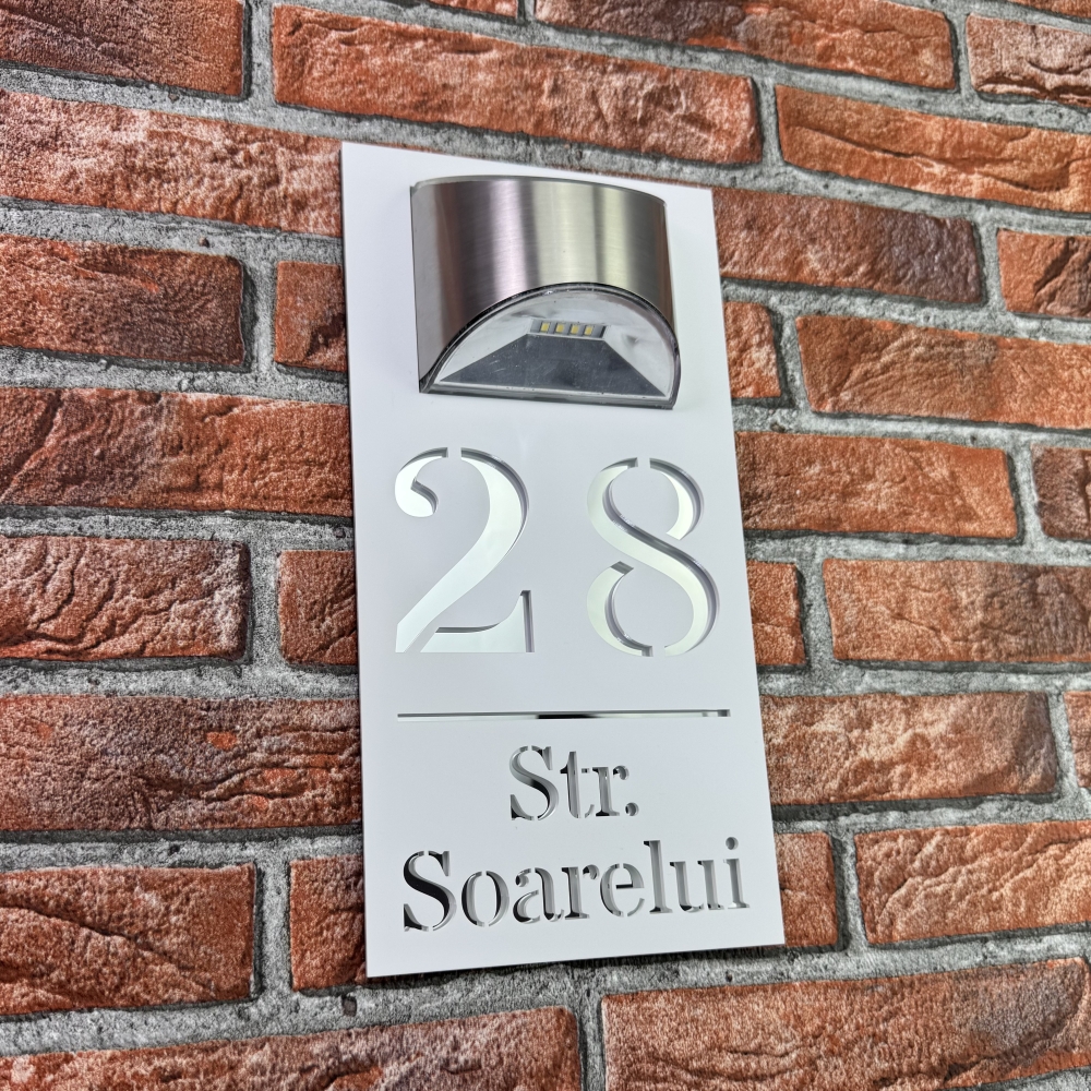 Placuta numar casa personalizat cu iluminare LED este alegerea perfecta pentru cei care doresc o combinatie intre eleganta moderna si functionalitate. Modelul HeavenLight aduce o inovatie practica, avand sistem de iluminare automata cu lampa solara si senzor de lumina. Acest design inteligent permite vizibilitatea numarului casei atat ziua, cat si pe timpul noptii, fara consum de energie electrica suplimentara. Dimensiunile produsului sunt 29.5 x 14.5 cm, ideale pentru a fi observate de la distanta si pentru a se integra armonios pe orice fatada.