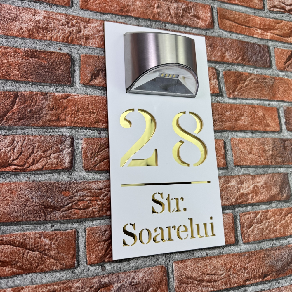 Realizata din materiale premium, aceasta placuta are un finisaj elegant Alb Mat / Oglinda Auriu combinat cu detalii oglinda auriu, oferind un aspect rafinat si modern. Suprafata este rezistenta la intemperii, iar structura solida asigura durabilitate in timp. Sistemul solar incorporat incarca bateria interna pe parcursul zilei, iar senzorul de lumina activeaza automat LED-ul la lasarea serii, garantand o luminozitate constanta si eficienta.