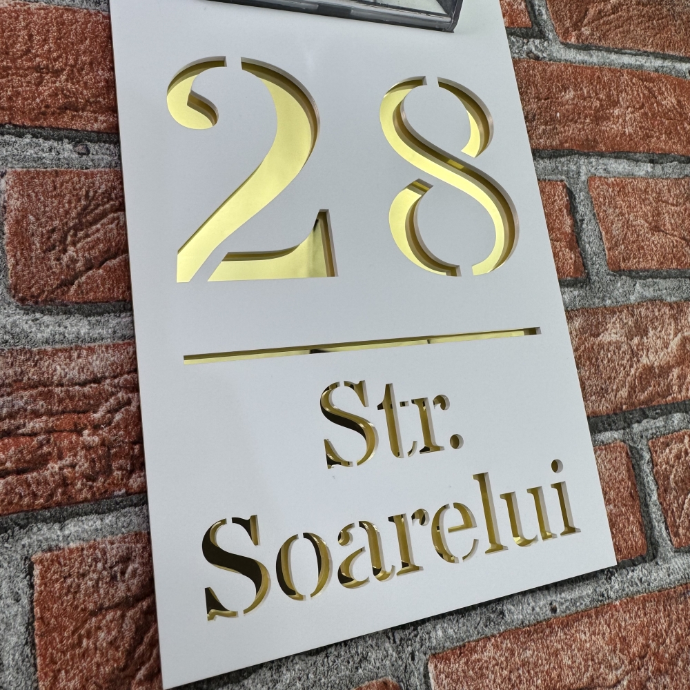 Placuta numar casa personalizat cu iluminare LED este alegerea perfecta pentru cei care doresc o combinatie intre eleganta moderna si functionalitate. Modelul HeavenLight aduce o inovatie practica, avand sistem de iluminare automata cu lampa solara si senzor de lumina. Acest design inteligent permite vizibilitatea numarului casei atat ziua, cat si pe timpul noptii, fara consum de energie electrica suplimentara. Dimensiunile produsului sunt 29.5 x 14.5 cm, ideale pentru a fi observate de la distanta si pentru a se integra armonios pe orice fatada.