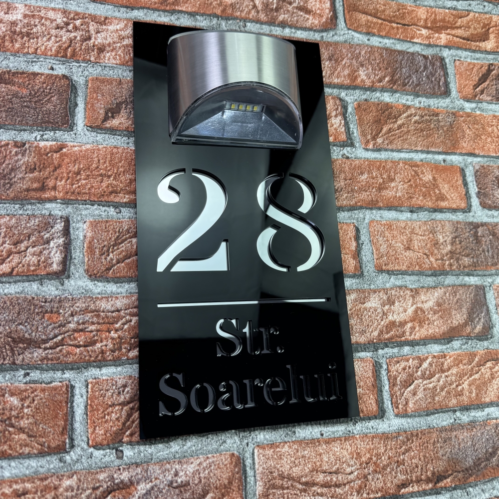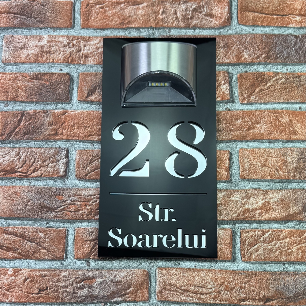Placuta numar casa personalizat cu iluminare LED este alegerea perfecta pentru cei care doresc o combinatie intre eleganta moderna si functionalitate. Modelul HeavenLight aduce o inovatie practica, avand sistem de iluminare automata cu lampa solara si senzor de lumina. Acest design inteligent permite vizibilitatea numarului casei atat ziua, cat si pe timpul noptii, fara consum de energie electrica suplimentara. Dimensiunile produsului sunt 29.5 x 14.5 cm, ideale pentru a fi observate de la distanta si pentru a se integra armonios pe orice fatada.