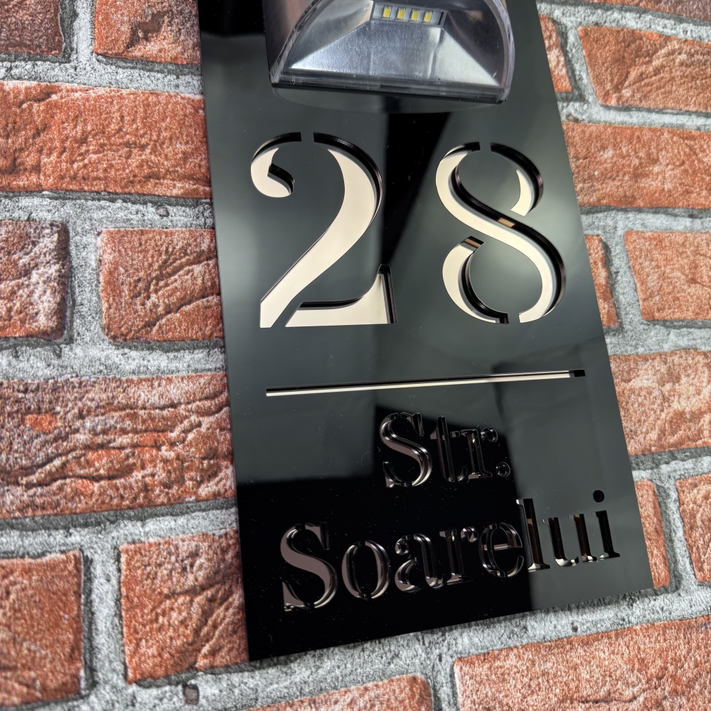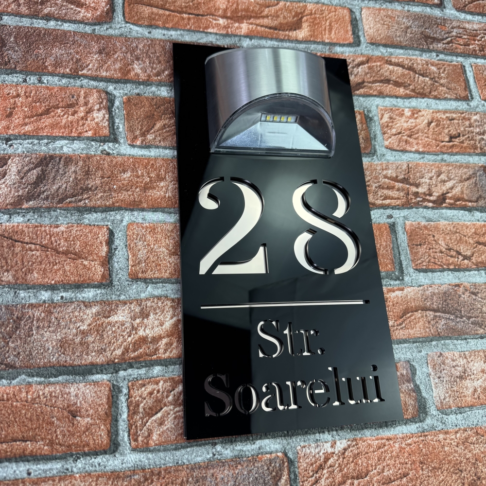 Placuta numar casa personalizat cu iluminare LED este alegerea perfecta pentru cei care doresc o combinatie intre eleganta moderna si functionalitate. Modelul HeavenLight aduce o inovatie practica, avand sistem de iluminare automata cu lampa solara si senzor de lumina. Acest design inteligent permite vizibilitatea numarului casei atat ziua, cat si pe timpul noptii, fara consum de energie electrica suplimentara. Dimensiunile produsului sunt 29.5 x 14.5 cm, ideale pentru a fi observate de la distanta si pentru a se integra armonios pe orice fatada.