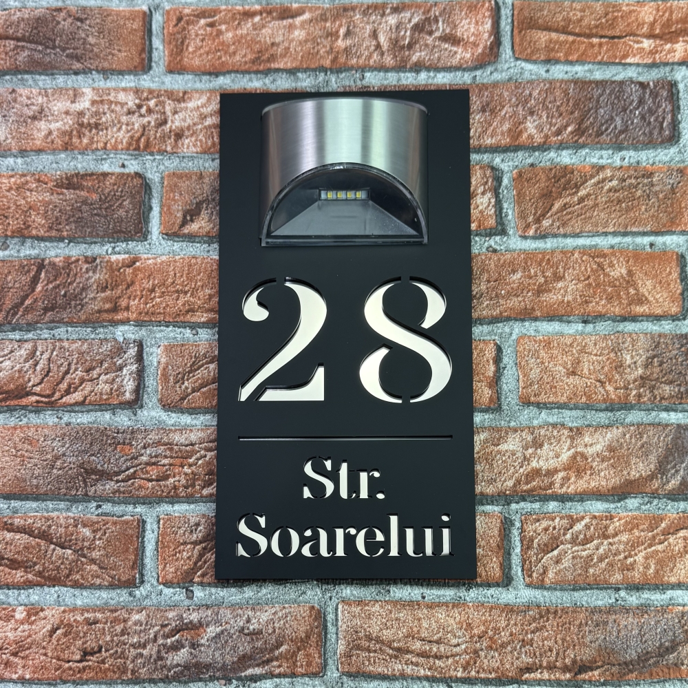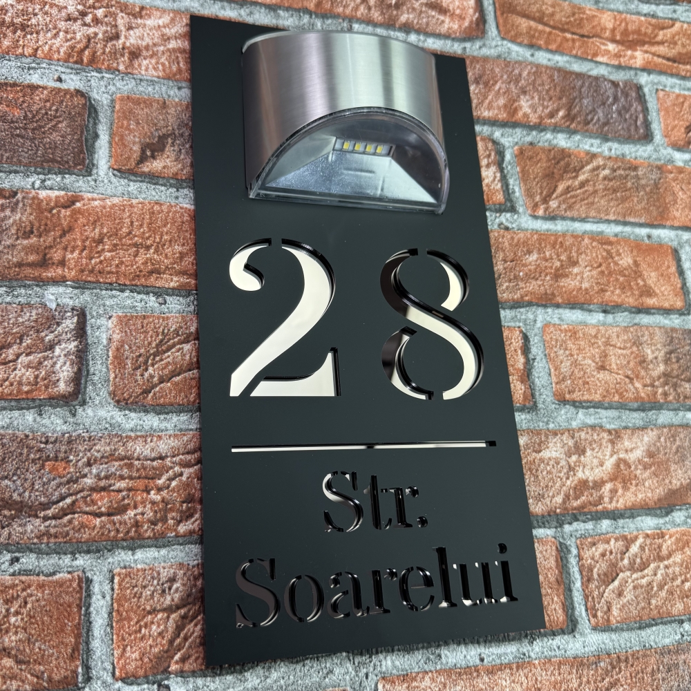 Placuta numar casa personalizat cu iluminare LED este alegerea perfecta pentru cei care doresc o combinatie intre eleganta moderna si functionalitate. Modelul HeavenLight aduce o inovatie practica, avand sistem de iluminare automata cu lampa solara si senzor de lumina. Acest design inteligent permite vizibilitatea numarului casei atat ziua, cat si pe timpul noptii, fara consum de energie electrica suplimentara. Dimensiunile produsului sunt 29.5 x 14.5 cm, ideale pentru a fi observate de la distanta si pentru a se integra armonios pe orice fatada.