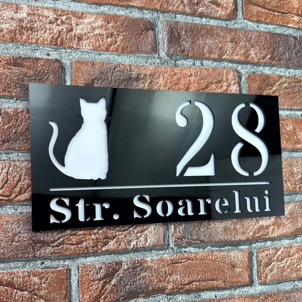 Placuta numar casa personalizat model ShadowCat este alegerea ideala pentru cei care apreciaza eleganta moderna si functionalitatea unui accesoriu exterior de calitate superioara. Cu un design rafinat si detalii atent realizate, aceasta placuta transforma intrarea casei intr-un punct vizual distinct si atractiv. Finisajul negru lucios, combinat cu accentele din alb mat, creeaza un contrast elegant si vizibil, potrivit atat pentru arhitectura moderna, cat si pentru stiluri clasice. Dimensiunea produsului este de 29.5 x 14.5 cm, suficient de mare pentru a fi usor de observat si totodata armonios integrata pe orice fatada.