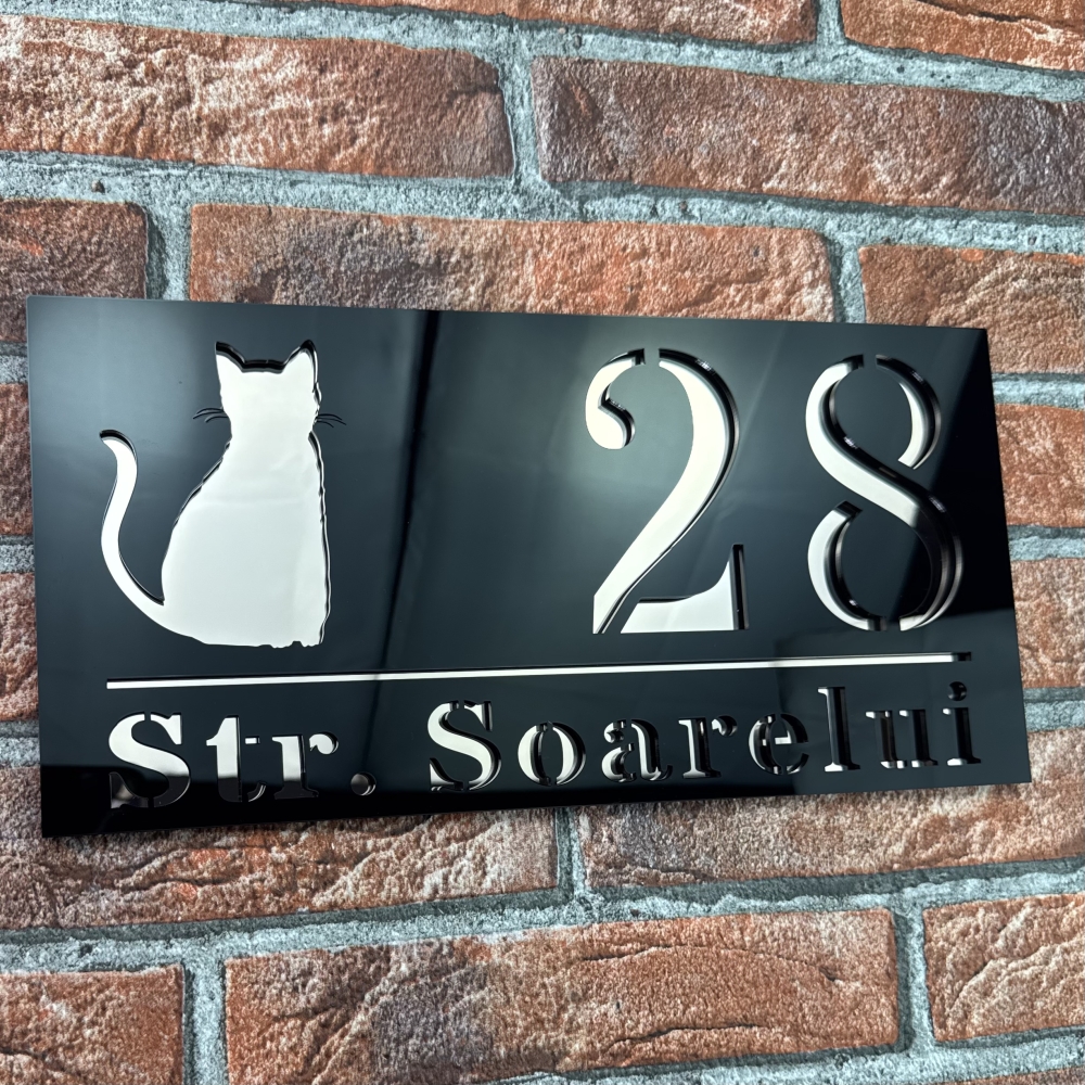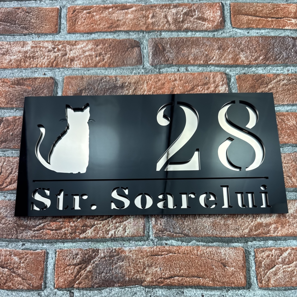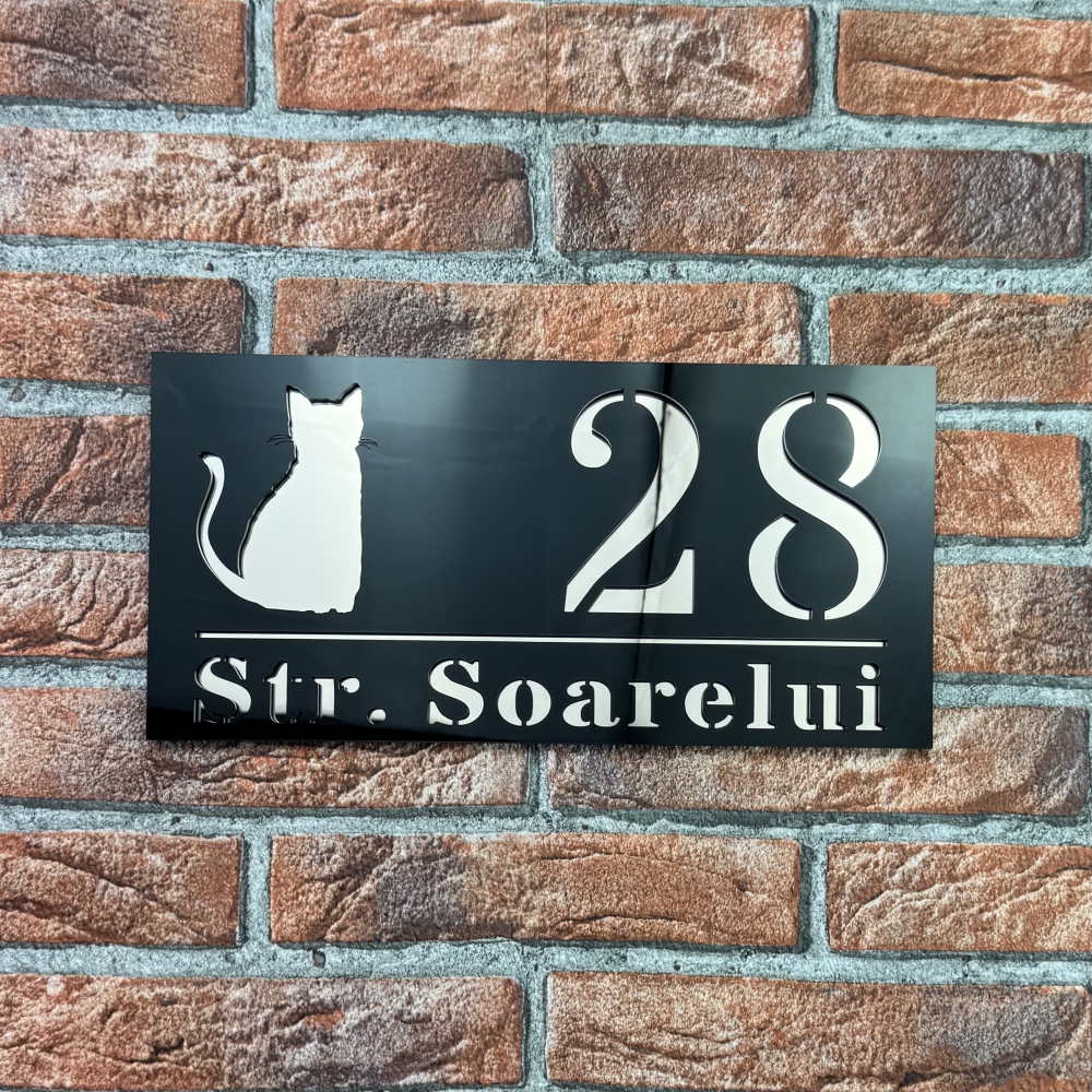 Montajul este simplu si rapid, toate accesoriile necesare fiind incluse. Placuta poate fi personalizata complet cu numarul si literele dorite, oferind unicitate si adaptabilitate fiecarei locuinte. Procesul de productie utilizeaza tehnologie de taiere laser moderna, garantand precizie, uniformitate si durabilitate. Modelul ShadowCat este potrivit pentru case private, vile, pensiuni sau birouri care doresc o imagine ordonata si sofisticata.