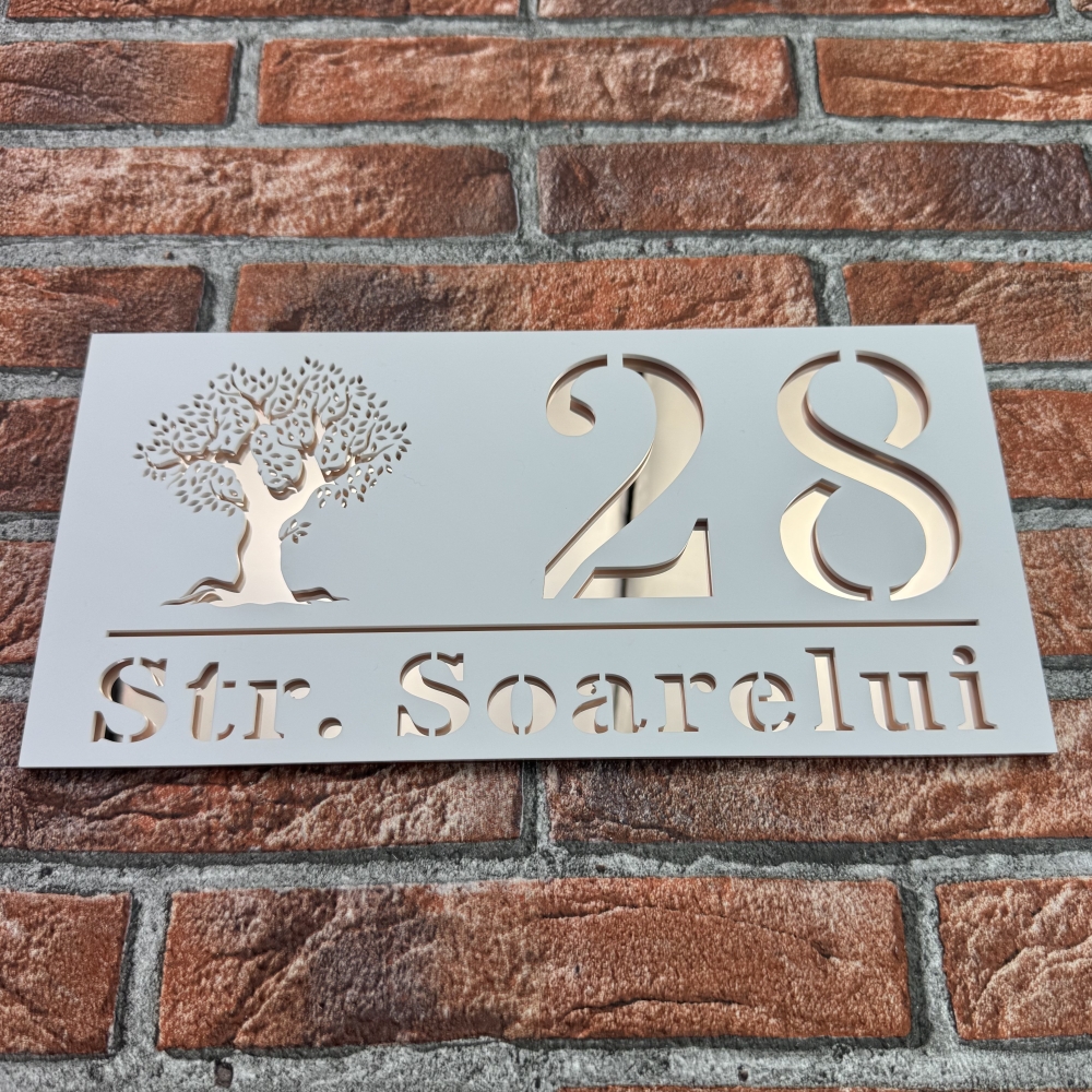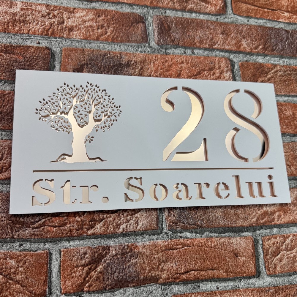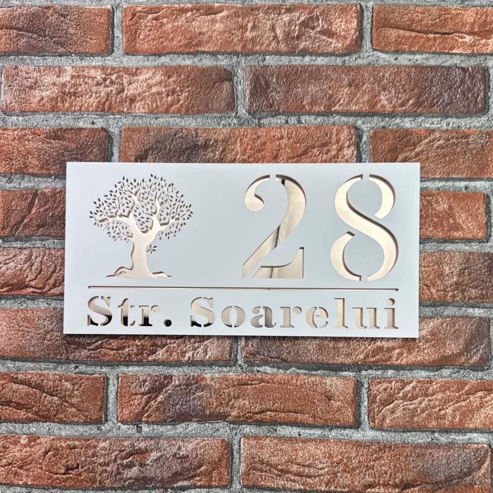 Cu o dimensiune de 29.5 x 14.5 cm, modelul TreeWave reprezinta un simbol al designului modern si al calitatii superioare. Alegand o placuta numar casa personalizat model TreeWave, iti transformi locuinta intr-un spatiu care emana eleganta si rafinament, dovedind ca si cele mai mici detalii pot face diferenta in aspectul general al casei tale.