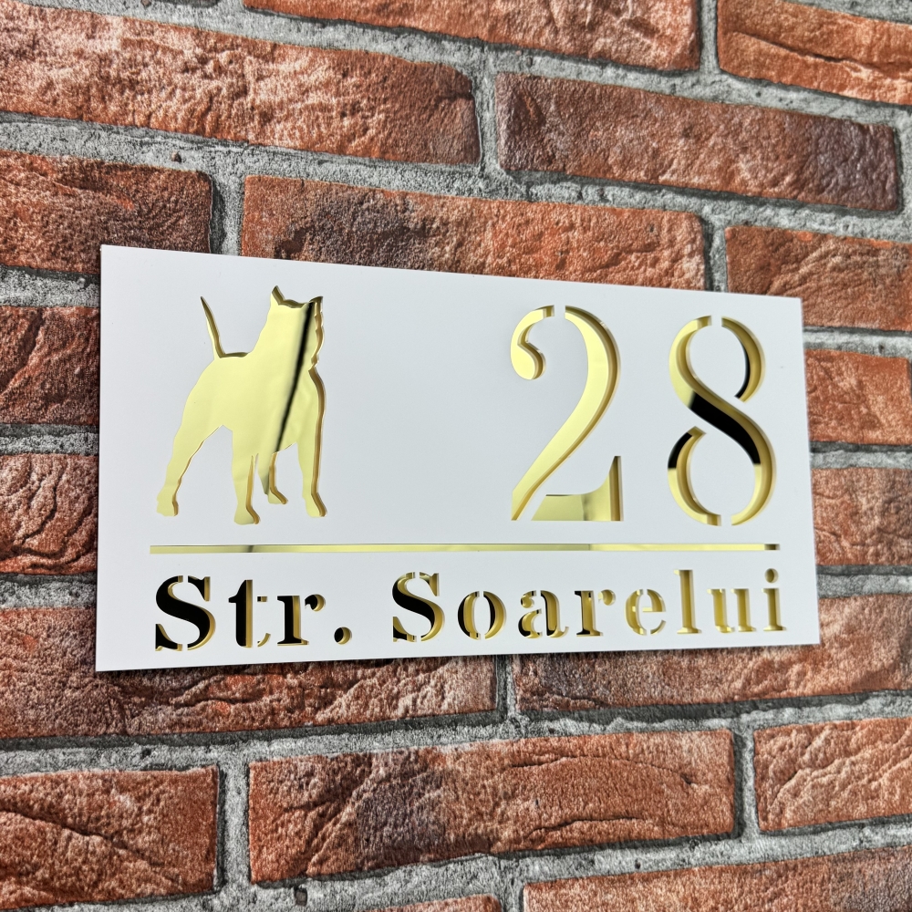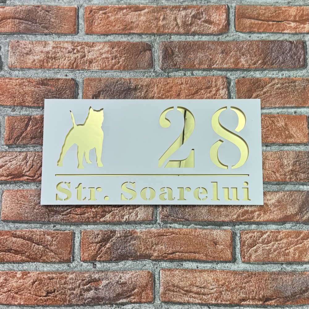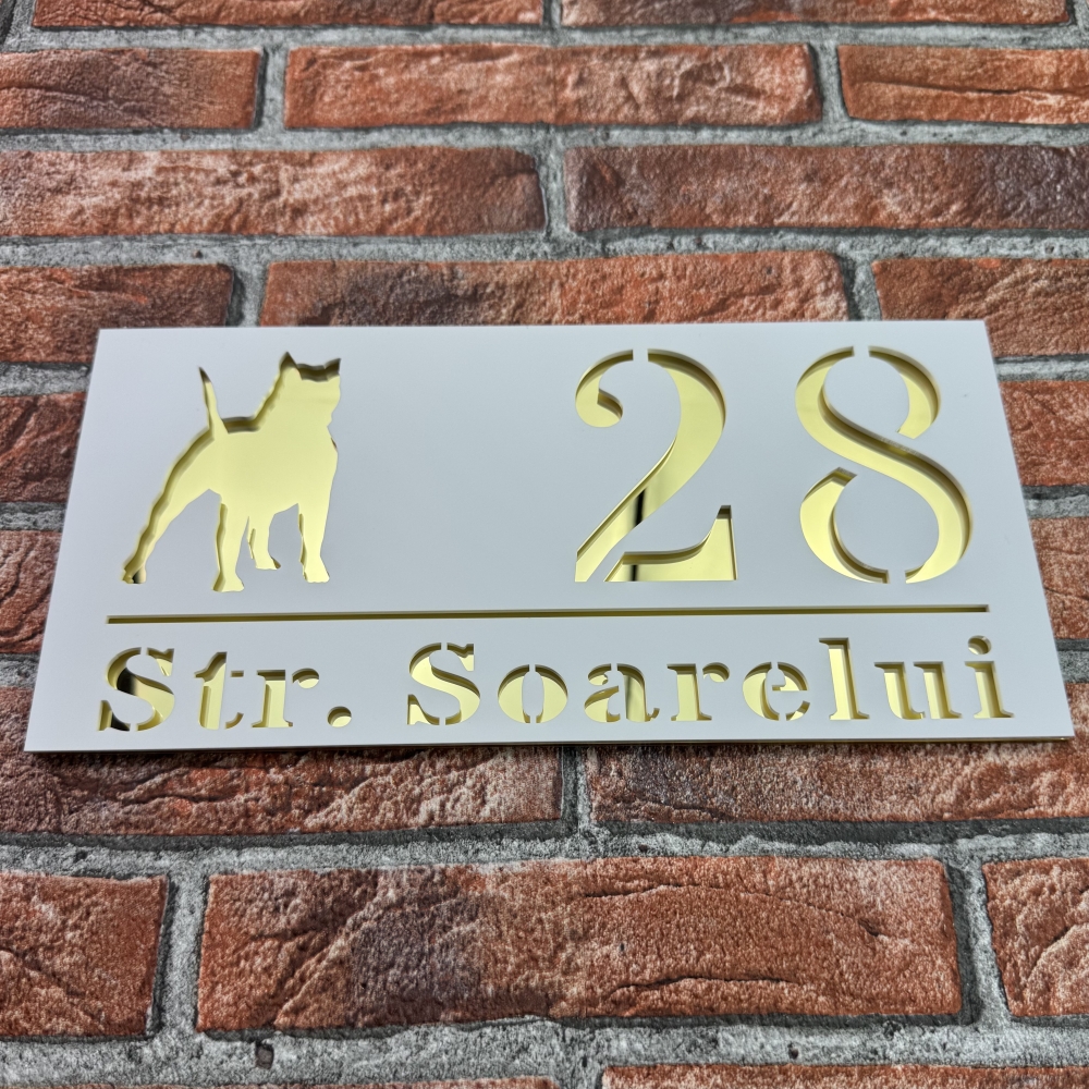 Aceasta placuta numar casa personalizat model WildDog este ideala atat pentru locuinte private, cat si pentru spatii comerciale, birouri sau pensiuni. Contrastul dintre Alb Mat si Oglinda Auriu asigura o lizibilitate excelenta, chiar si de la distanta. Fiind personalizabila complet, poti alege cifrele sau literele potrivite pentru adresa ta, obtinand un produs unic si reprezentativ.