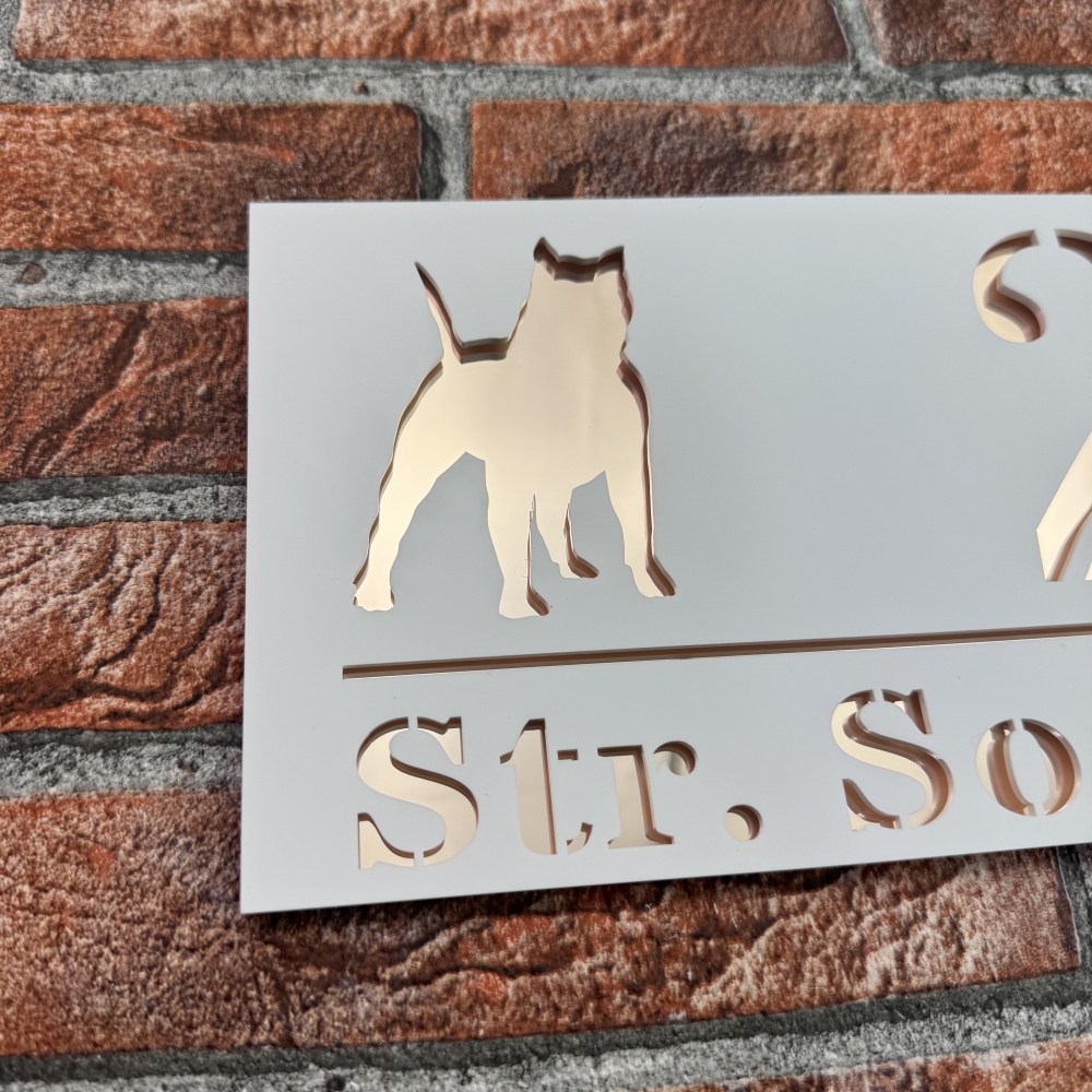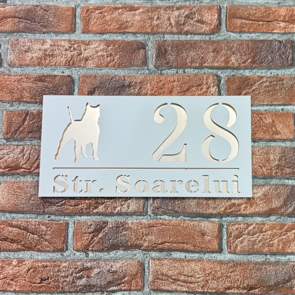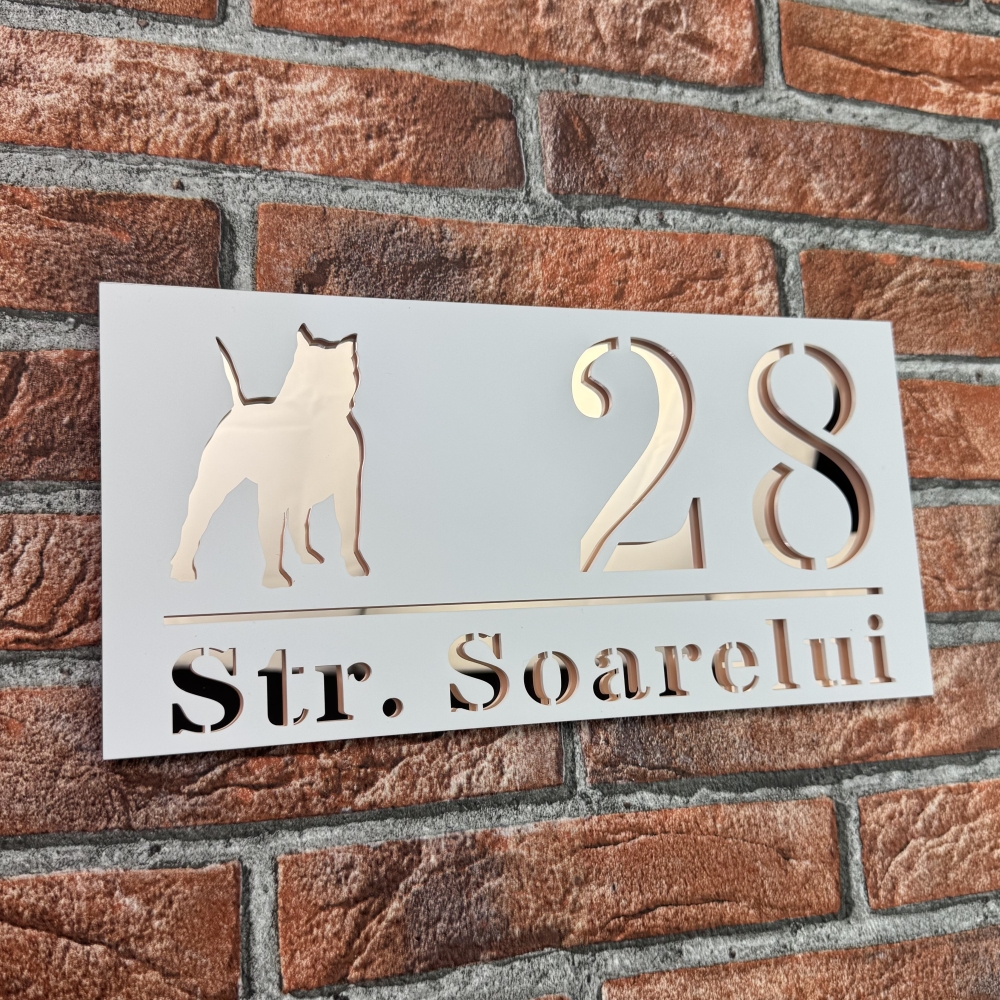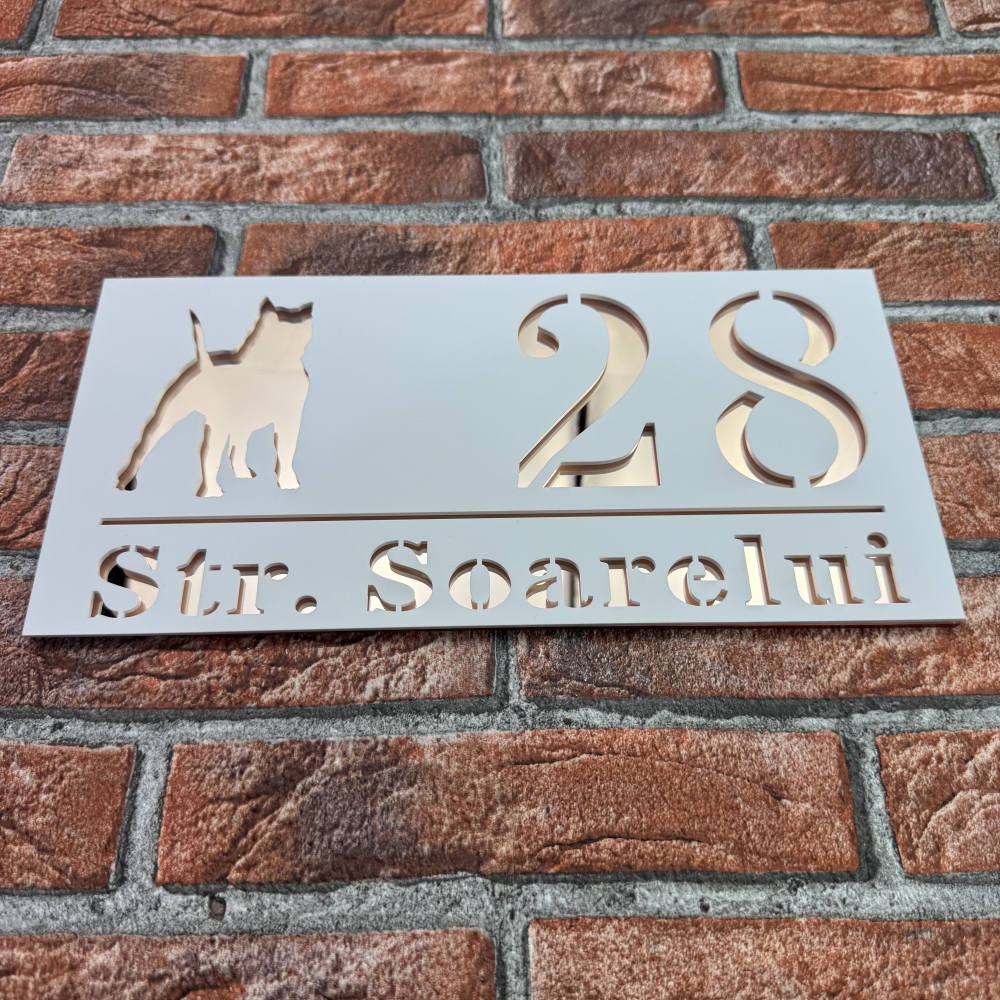 Aceasta placuta numar casa personalizat model WildDog este ideala atat pentru locuinte private, cat si pentru spatii comerciale, birouri sau pensiuni. Contrastul dintre Alb Mat si Oglinda Roz asigura o lizibilitate excelenta, chiar si de la distanta. Fiind personalizabila complet, poti alege cifrele sau literele potrivite pentru adresa ta, obtinand un produs unic si reprezentativ.