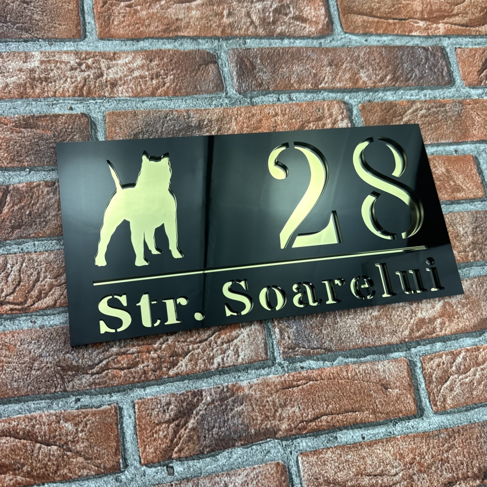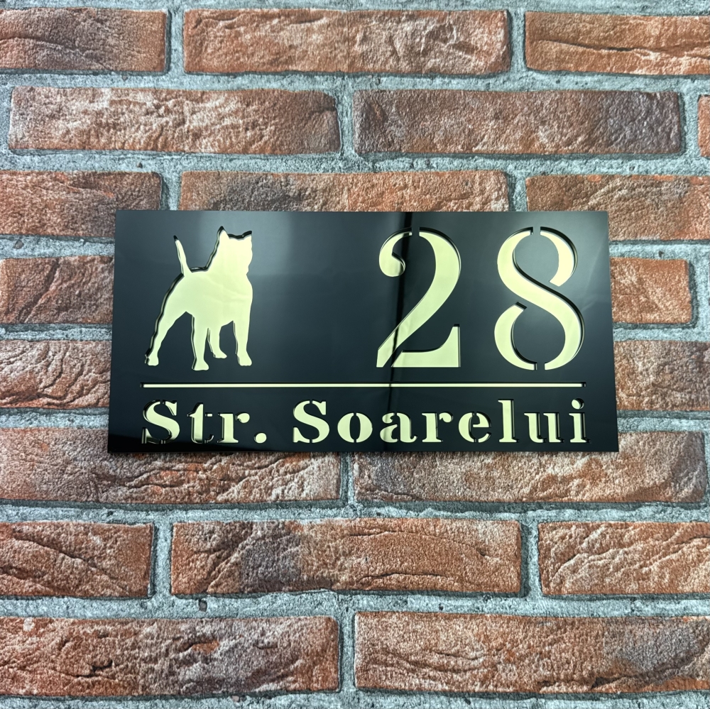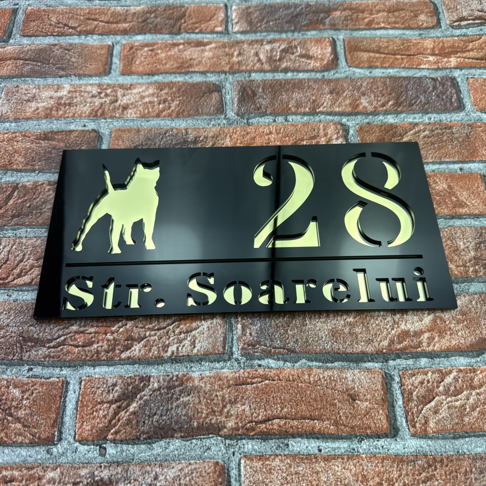 Aceasta placuta numar casa personalizat model WildDog este ideala atat pentru locuinte private, cat si pentru spatii comerciale, birouri sau pensiuni. Contrastul dintre Negru Lucios si Oglinda Auriu asigura o lizibilitate excelenta, chiar si de la distanta. Fiind personalizabila complet, poti alege cifrele sau literele potrivite pentru adresa ta, obtinand un produs unic si reprezentativ.