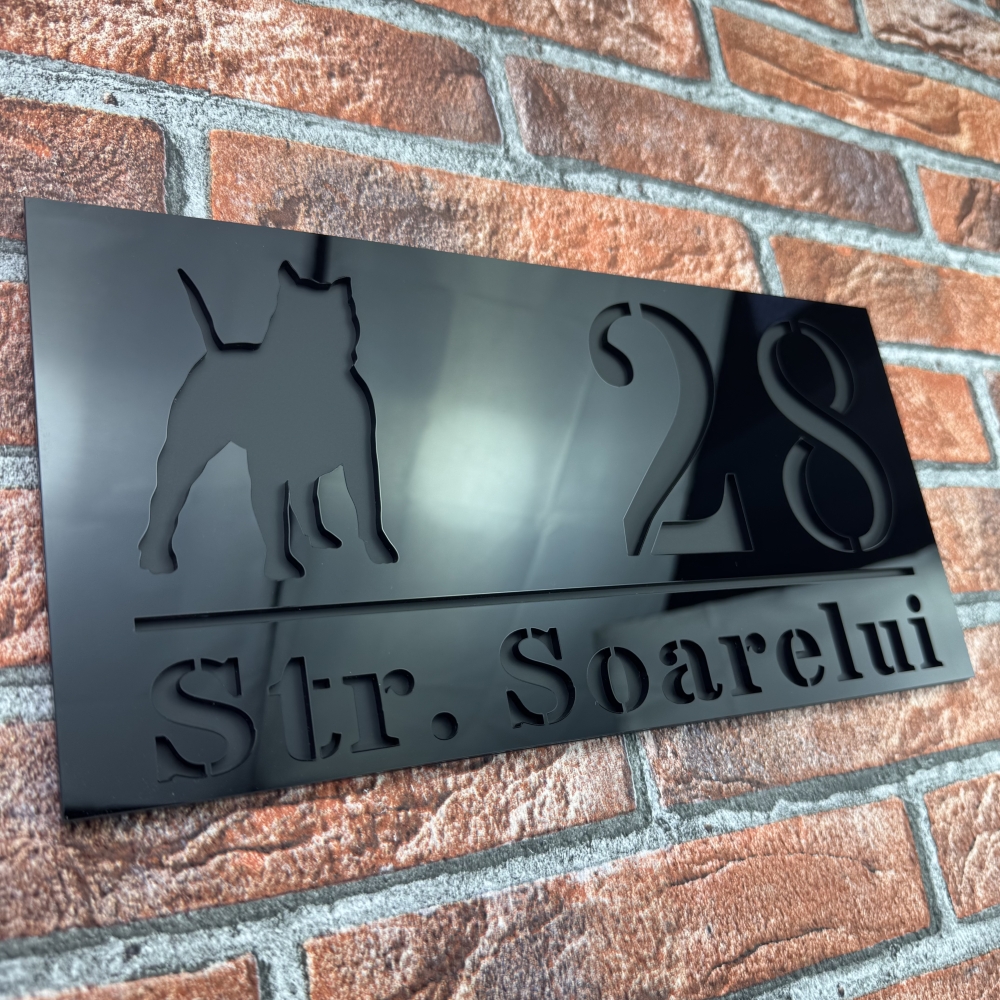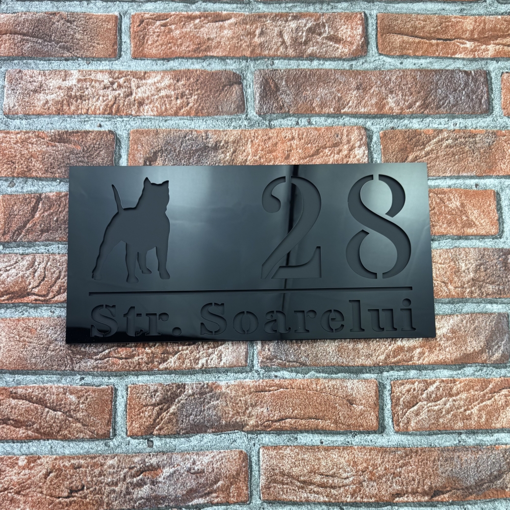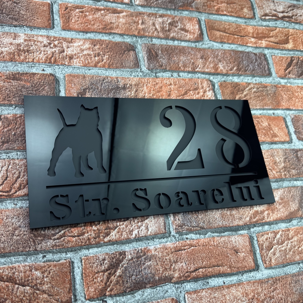 Placuta numar casa personalizat model WildDog reprezinta o combinatie perfecta intre design modern, rezistenta si stil distinctiv. Realizata cu atentie la detalii, aceasta placuta se evidentiaza prin contrastul elegant dintre Negru Lucios si Negru Mat, oferind un aspect premium si contemporan. Dimensiunile produsului sunt 29.5 x 14.5 cm, perfecte pentru o vizibilitate excelenta si o integrare armonioasa pe orice tip de fatada.