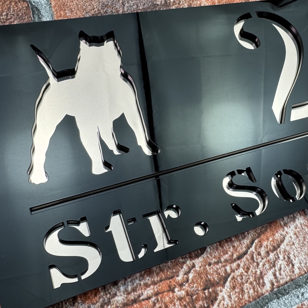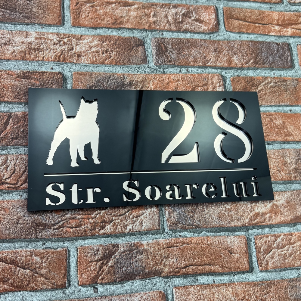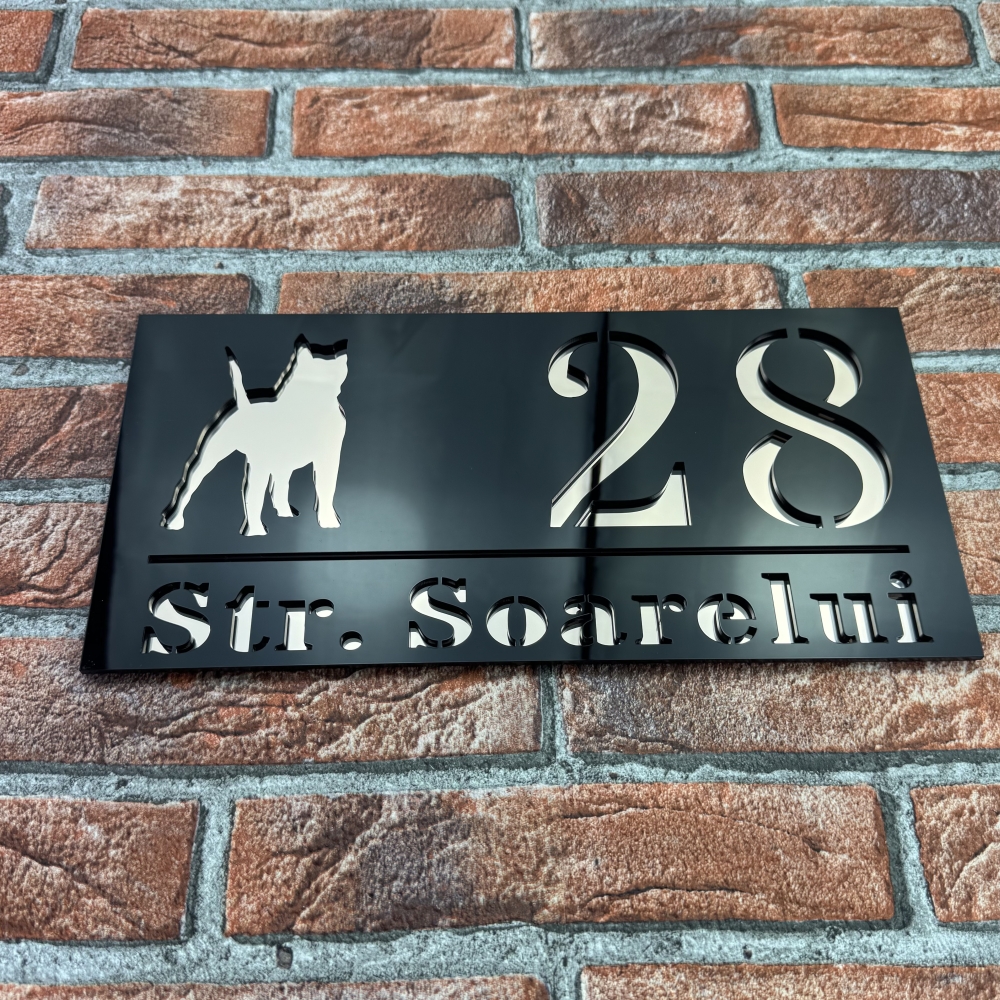 Aceasta placuta numar casa personalizat model WildDog este ideala atat pentru locuinte private, cat si pentru spatii comerciale, birouri sau pensiuni. Contrastul dintre Negru Lucios si Oglinda Roz asigura o lizibilitate excelenta, chiar si de la distanta. Fiind personalizabila complet, poti alege cifrele sau literele potrivite pentru adresa ta, obtinand un produs unic si reprezentativ.