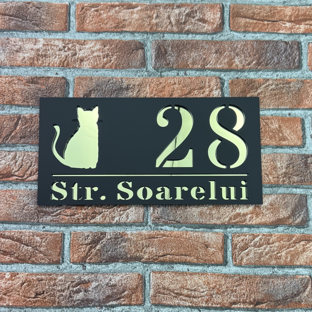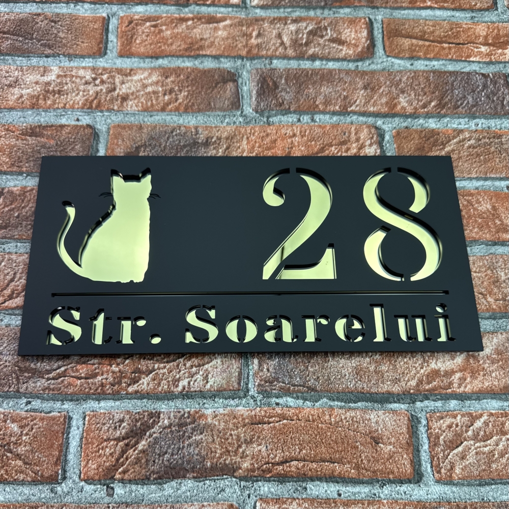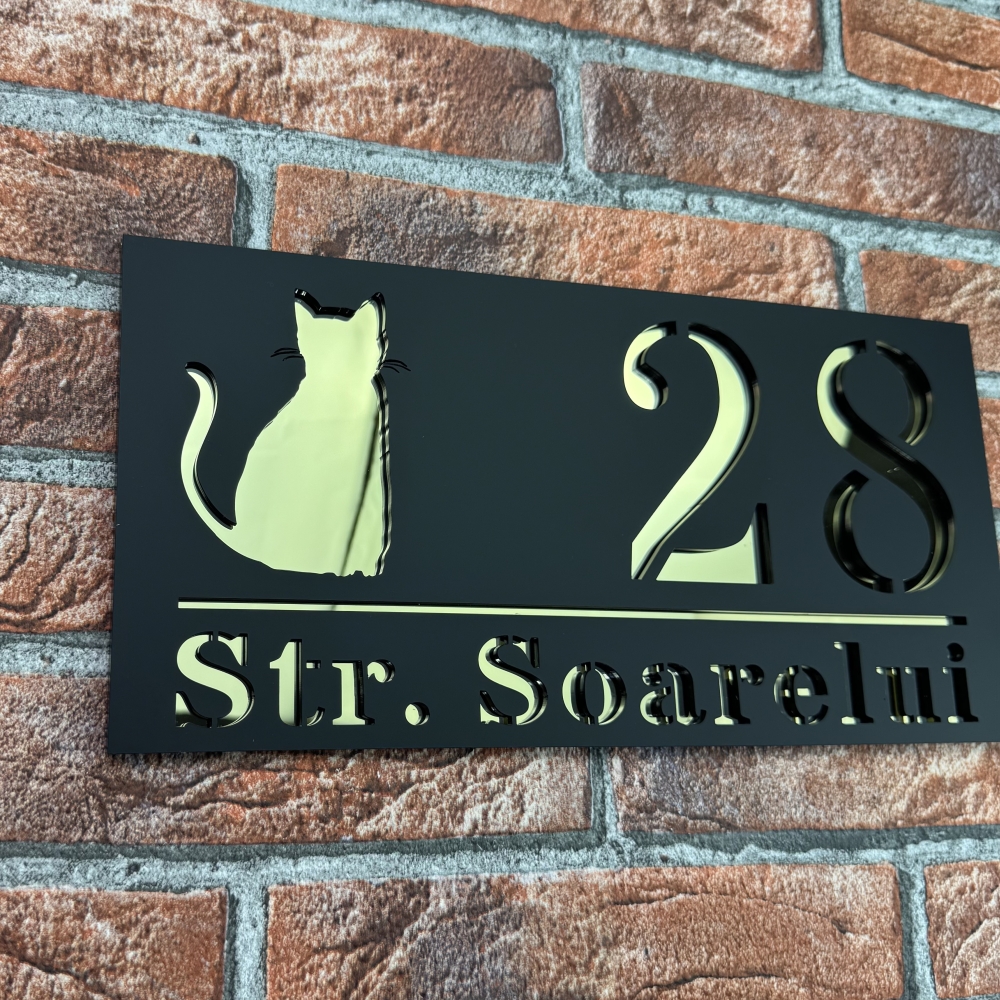 Aceasta placuta numar casa personalizat model ShadowCat imbina estetica si rezistenta, oferind un aspect premium si un plus de stil intrarii locuintei. Combinatia de negru mat si oglinda auriu creeaza un contrast vizual deosebit, care evidentiaza numarul casei si subliniaza bunul gust al proprietarului. Alegand o placuta numar casa personalizat model ShadowCat, investesti intr-un produs durabil, elegant si personalizabil, care va pastra farmecul estetic multi ani.