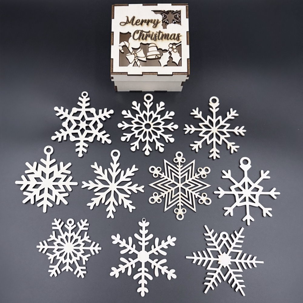 Adauga un strop de magie de iarna decorului tau festiv cu acest set elegant de 10 fulguri de Craciun din lemn. Fiecare ornament are un diametru de 9 cm si este realizat din placaj de plop de inalta calitate, decupat cu laser pentru detalii precise si un aspect vizual deosebit.