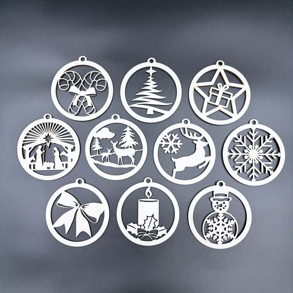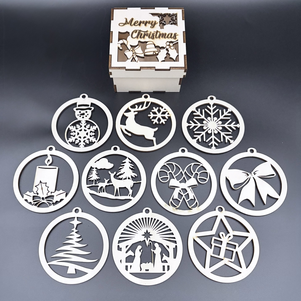 Set de 10 globuri de Craciun din lemn, diametru 9 cm, realizate prin taiere laser pentru un finisaj precis. Aspect natural, ideal pentru brad sau decoruri festive. Livrate intr-o cutie cadou eleganta.